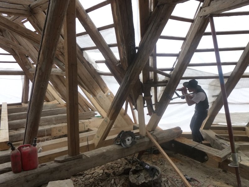 Die Zimmerleute haben vier Wochen lang Dachbalken an der St. Petrus-Kirche saniert. Teilweise mußten die Balken komplett ersetzt werden, an anderen Stellen wird neu und alt zusammengefügt. In der zweiten Juli-Hälfe wurden die alten Dachziegel komplett abgenommen und das Dach neu gedeckt. Der Kirchenvorstand sammelt weiterhin Spendengelder für die Dachsanierung. Dazu werden Regenschirme, T-Shirts und St. Petrus-Wein verkauft. Insgesamt benötigt die Kirchengemeinden 40.000 Euro Eigenmittel für die Dachsanierung. 31.500 Euro wurden bereits gespendet. Dafür dankt der Kirchenvorstand allen Spenderinnen und Spendern.