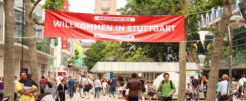 Stuttgart ist bereit. Die ganze Stadt ist in Kirchentags-Rot getaucht. Am Mittwoch um 18.15 Uhr beginnt der 35. Deutsche Evangelische Kirchentag mit drei Eröffnungsgottesdiensten unter freiem Himmel in der Innenstadt. Danach eröffnet Kirchentagspräsdent Prof. Dr. Dr. Andrea Barner den Kirchentag offiziell auf dem Schlossplatz in Stuttgart.