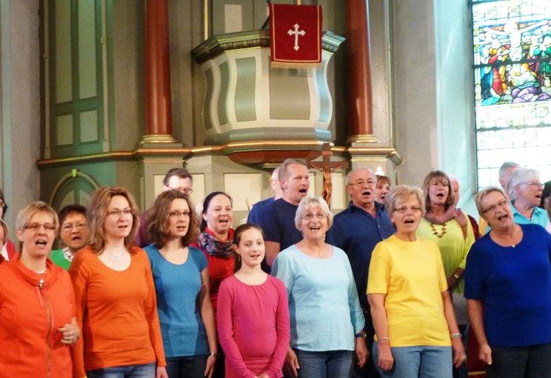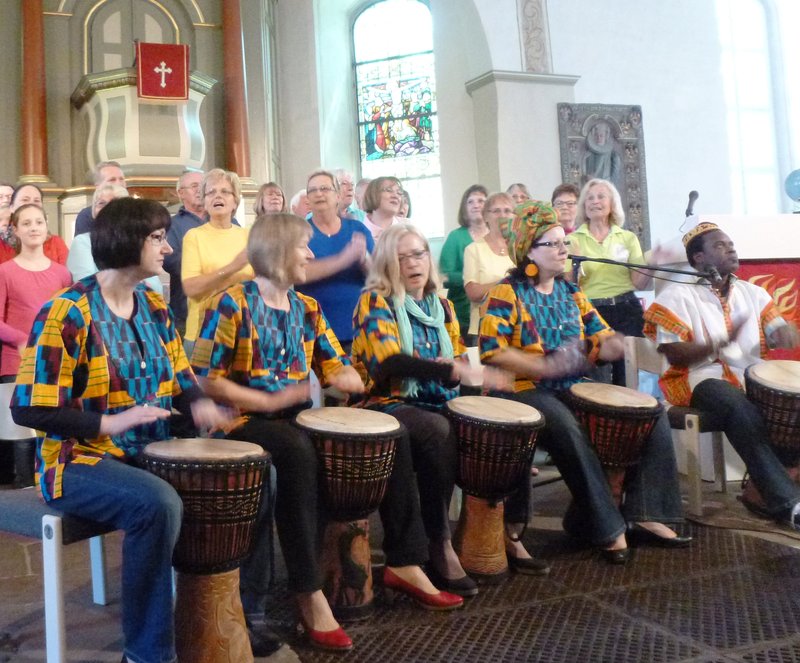 Schwungvoll und fröhlich erklang es zu Pfingsten in der St. Petrus-Kirche. Mit dem Afrika-Projektchor unter der Leitung von Propsteikantor Paul-Gerhard Blüthner und dem Trommelparadies e.V. mit Comian Edoh ertönten ungewohnte und neue Klänge im Gottesdienst.
