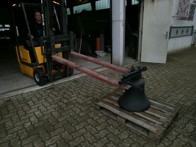 Zunächst muss die Glocke noch in die Werkstatt, damit das Joch wieder stabilisiert wird. (Erstes Foto). Dann bekommt sie eine Holzkiste als Transportverpackung und ab geht es ins Flugzeug.