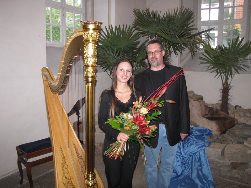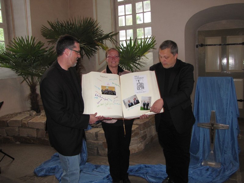 Das Ambiente an der Gebetsoase mit den Palmen in der Oase faszinierte auch den angereisten Vertreter aus dem Kulturbüro der EKD in Berlin. Klaus-Martin Bresgott besucht derzeit pro Landeskirche zwei Veranstaltungsorte der Konzertreihe 366+1. Die Besonderheit dieser Musikandacht mit Harfe an der Gebetsoase hat ihn nach Vorsfelde gelockt. Dazu brachte er persönlich das große Konzertbuch mit, dass bei jeder dieser Veranstaltungen ausliegt, gestaltet wird und dann weiterreist zum nächsten Auftritt. Bresgott dazu: "Diese Buch hat bisher alle 158 Konzerte gehört."