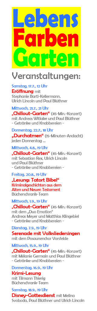 Es gibt wieder etwas zu entdecken an der St. Petrus-Kirche. Vielleicht haben Sie sich schon über die merkwürdigen Holzpfähle rund um die Kirche gewundert. Die Auflösung des Rätsels erscheint spätestens bei der Eröffnung unseres "Lebensfarbengartens" am Samstag, 17.7., um 12 Uhr. Die beiden Hauptorganisatorinnen Birgit van der Velten und Simone Rieger haben sich einiges einfallen lassen zum Thema "Glaube - Liebe - Hoffnung". Ob für Erwachsene oder für Kinder, ob zum Sehen oder zum Hören, zum Ausprobieren, zum Lesen, zum Nachdenken oder einfach nur zum Entspannen. Für jeden und jede ist etwas dabei. Dabei soll die St. Petrus-Kirche bewusst als Ortsmittelpunkt für die ganze Bevölkerung wahrgenommen werden. Das vorläufige Programm (es wird bestimmt noch im Laufe des Sommers ergänzt werden) finden Sie hier.