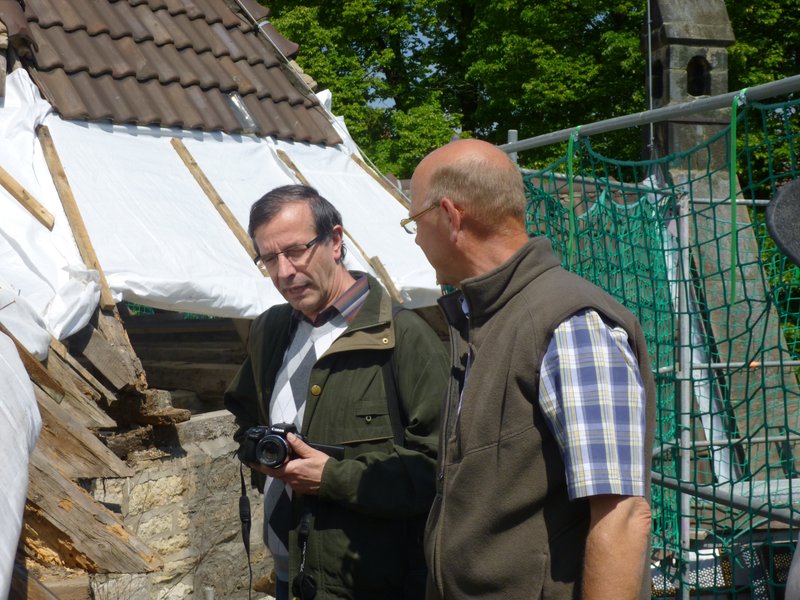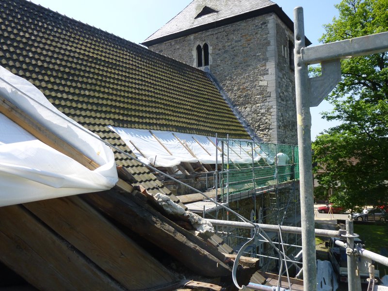Die Dachsanierung hat begonnen. Seit Anfang Mai steht das Gerüst am Langschiff der St. Petrus-Kirche. Die Zimmerleute der Werkstätten für Denkmalpflege aus Quedlinburg haben inzwischen begonnen die alten Dachbalken zu überprüfen und dazu teilweise auszubauen.