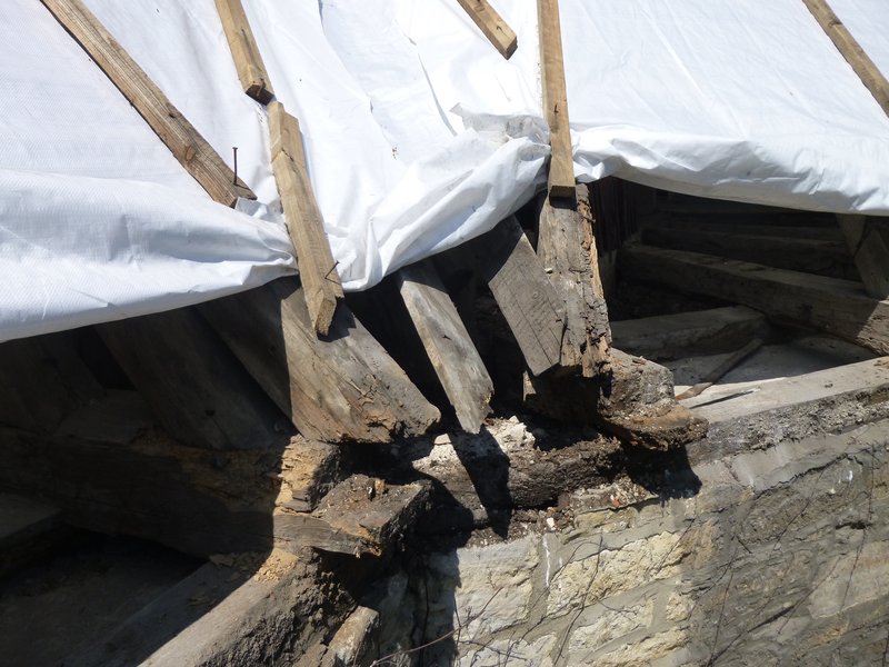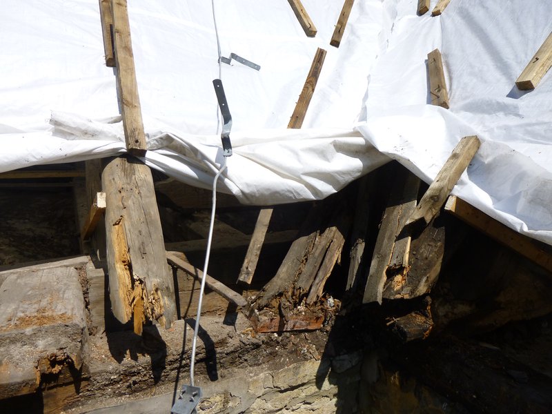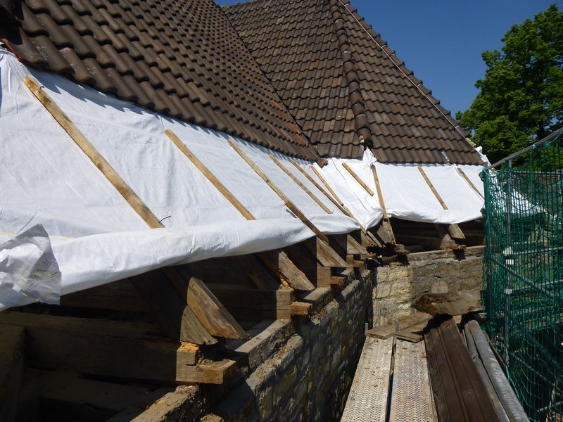 Die Schäden am Gebälk, die derzeit genauer überprüft werden, sind bisher nicht größer, als die Ergebnisse der Voruntersucherungen ergeben hatten. Aus jahrhunderte alten Eichenbalken werden nun nach und nach die morschen Holzteile herausgetrennt und ersetzt. Anschließend setzen die Zimmerleute die Balken wieder ein.