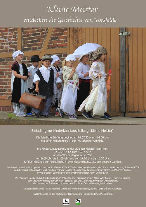 "Kleine Meister" ist ein beeindruckendes Projekt der Kindertagesstätten (Kitas) in Vorsfelde, die zusammen mit zwei Künstlern aus Berlin, diesen sehenswerten 15-minütigen Film mit den Kindern gedreht haben. Zeichentrickszenen und Schwarz-Weiß-Sequenzen lockern den Film auf. "Das ist Geschichte lebendig und einprägsam", sagen jüngere und ältere Besucher. Die Ausstellung findet symbolisch in zwei Bauwagen vor der St. Petrus-Kirche statt, weil die ersten Kindergärten in Vorsfelde in Eisenbahnwaggons untergebracht waren.