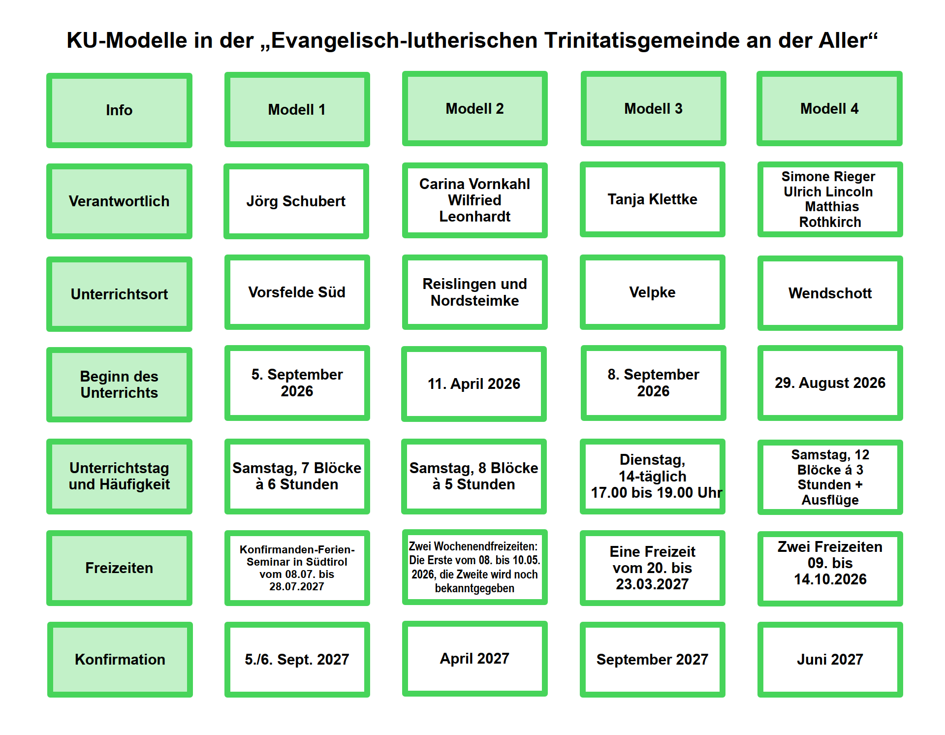 Die Jugendlichen haben die Möglichkeit, unter vier verschiedenen Modellen an vier unterschiedlichen Orten am Unterricht teilzunehmen. Das reicht vom dreiwöchigen Konfirmanden-Ferienseminar über Blockunterricht am Sonnabend bis hin zu Unterricht alle 14 Tage.