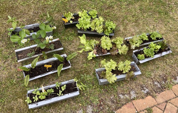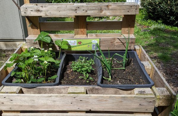 Die abgeernteten Erdbeerpflanzen haben in einem Privatgarten Platz gefunden. Die entstandenen Lücken sind mit Petersilie, Rosmarin, Oregano, neuen Salatpflänzchen, Tomaten und einer beim Foodsharing geretteten Brombeere aufgefüllt worden.