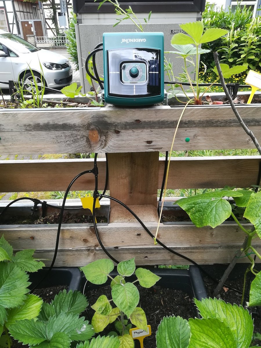 Der Naschgarten wird mit Regenwasser bewässert. Im letzten Jahr musste regelmäßig -auch im Urlaub- mit der Gießkanne gegossen werden. In diesem Juni wurde zunächst an einem Hochbeet die solarbetriebene Bewässerung ausprobiert. Da alles gut funktionierte konnten die beiden anderen Beete auch mit Bewässerungsautomaten nachgerüstet werden. Nur wenige, kleine Kästen in den Seitenfächern müssen manuell gegossen werden.