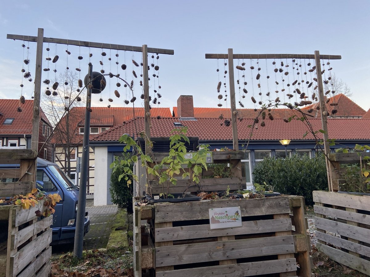 Die Ernte im Naschgarten ist für dieses Jahr weitgehend abgeschlossen und die Beete sind mit Laub bedeckt. Statt der Wimpelkette schaukeln nun wieder diverse Zapfen im Wind. Für die Vögel gibt es aber auch in der Winterpause etwas zu naschen.