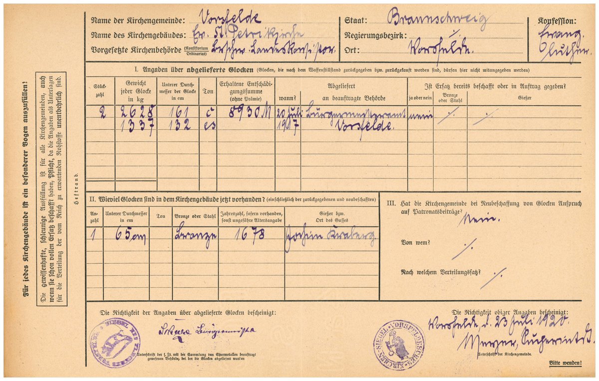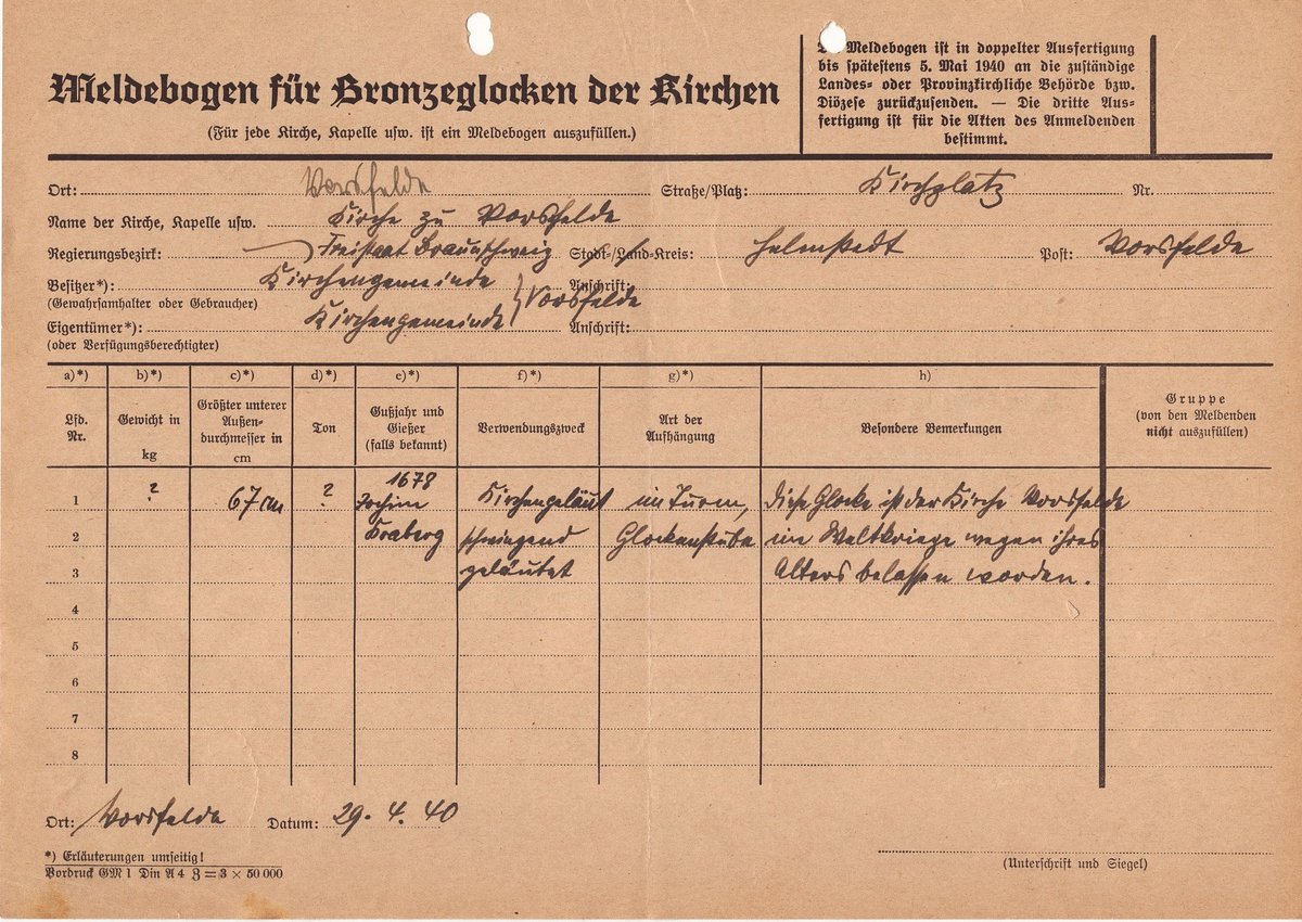 Abgabe der kleine Bronzeglocke ‚Stimmglocke‘ von 1678 (1692 Einbau) zu Kriegszwecken