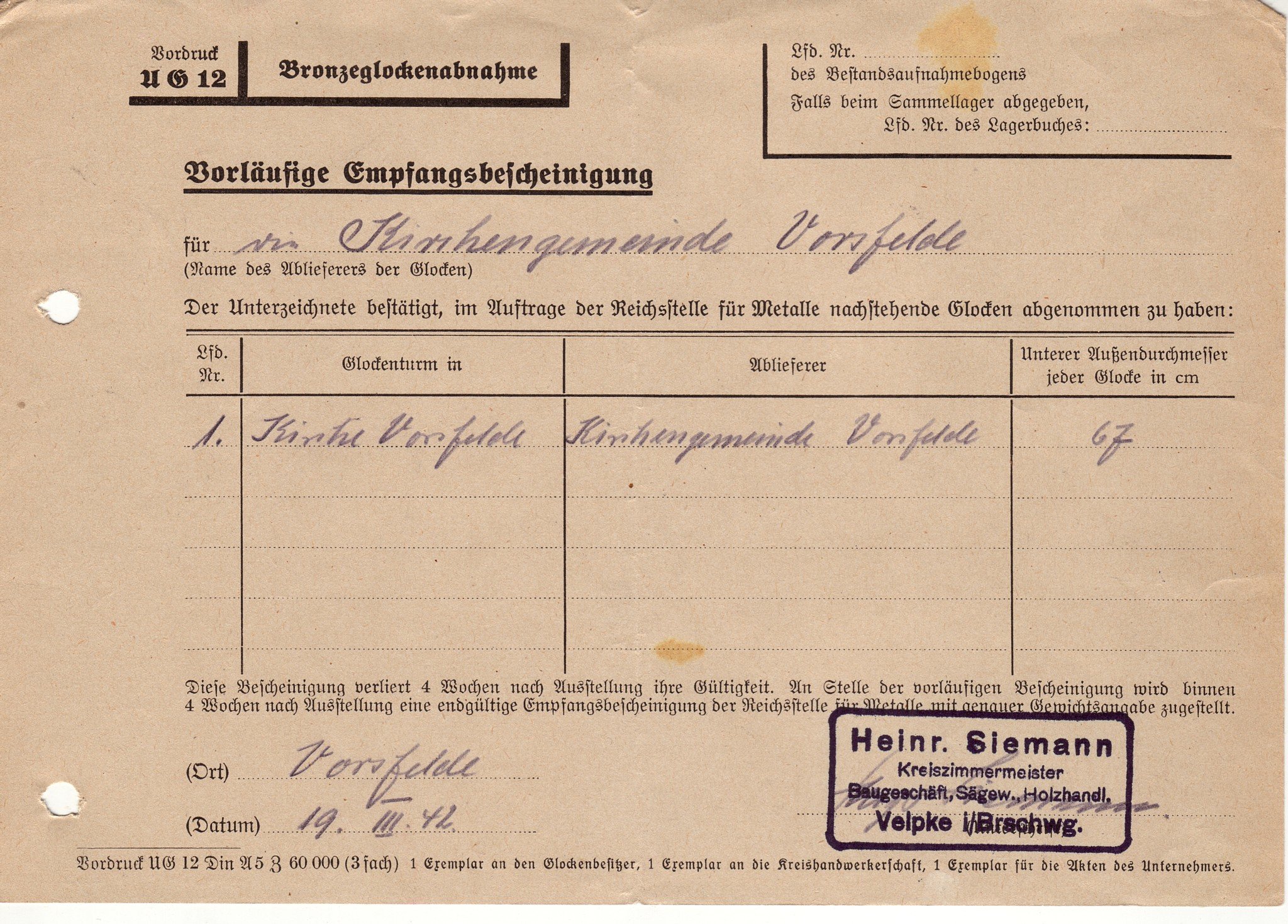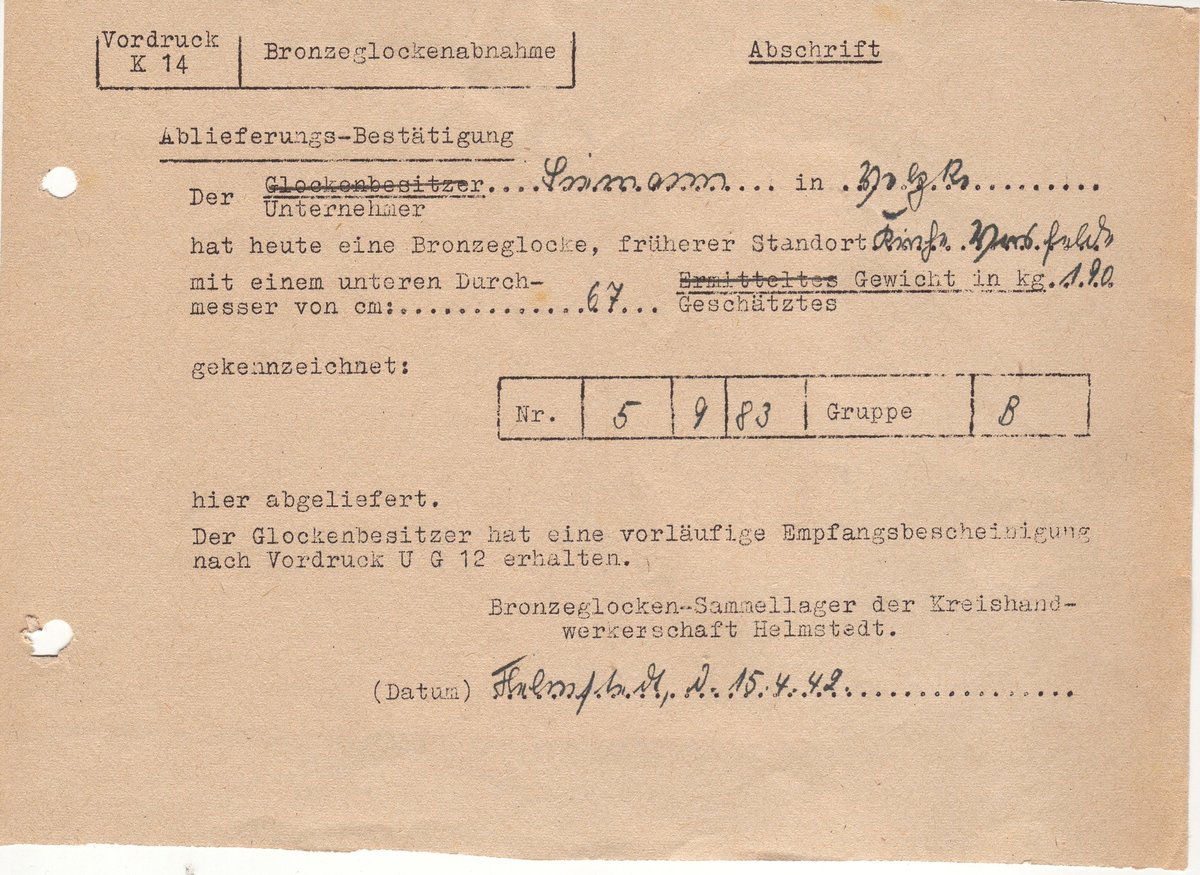 Auslieferungsbestätigung Bronzeglocken Sammellager der Kreishandwerkerschaft Helmstedt