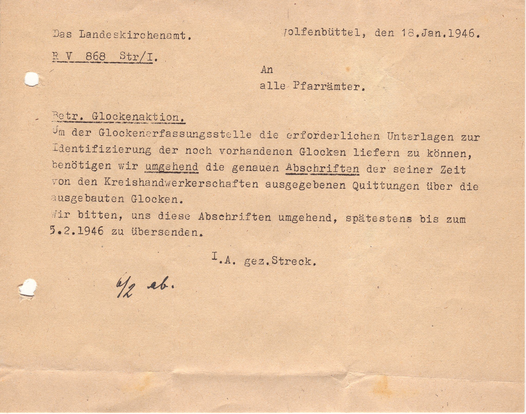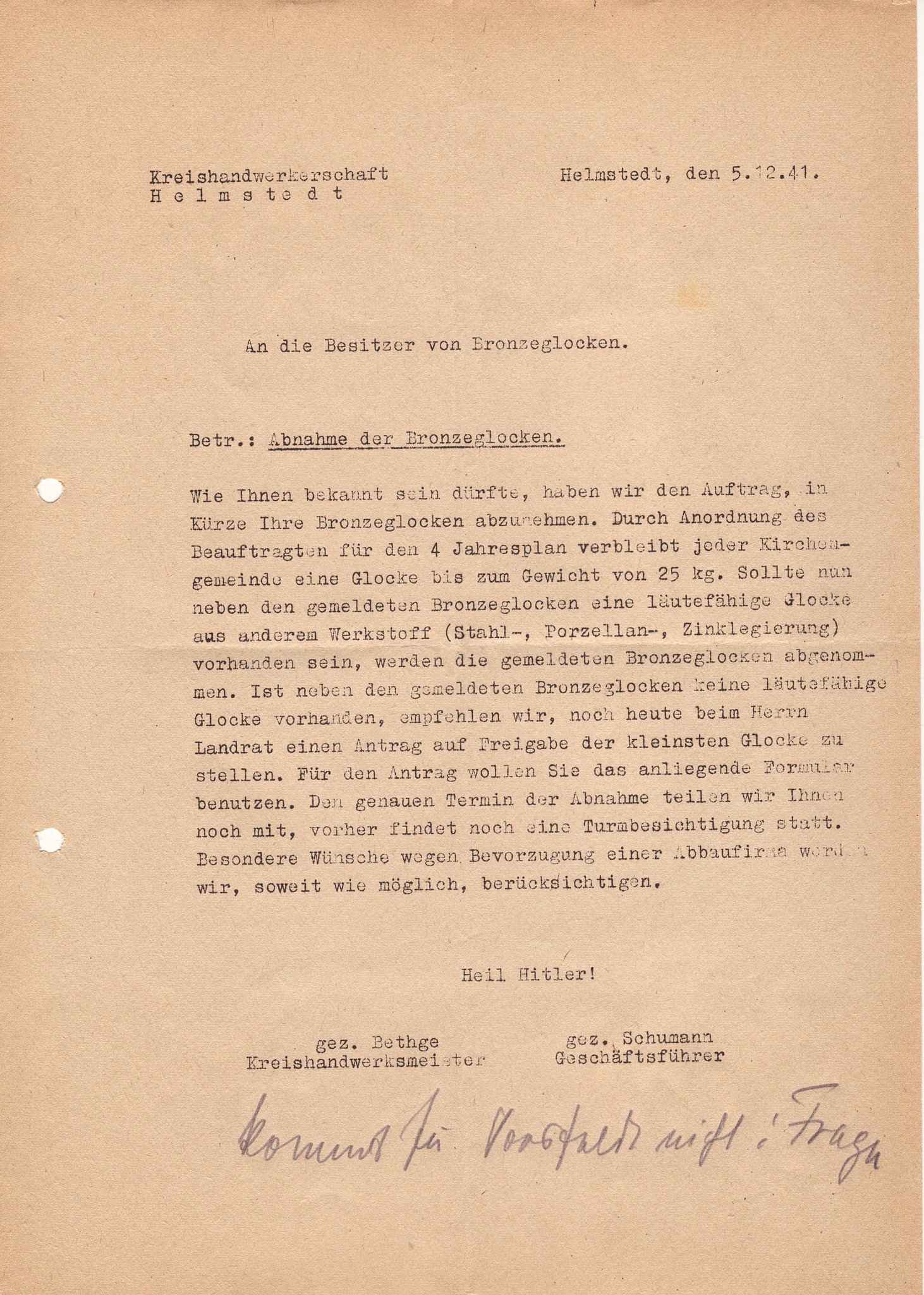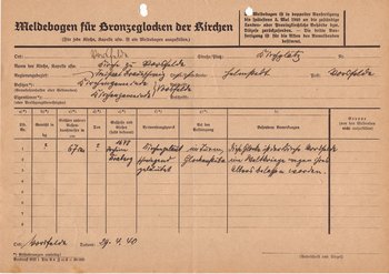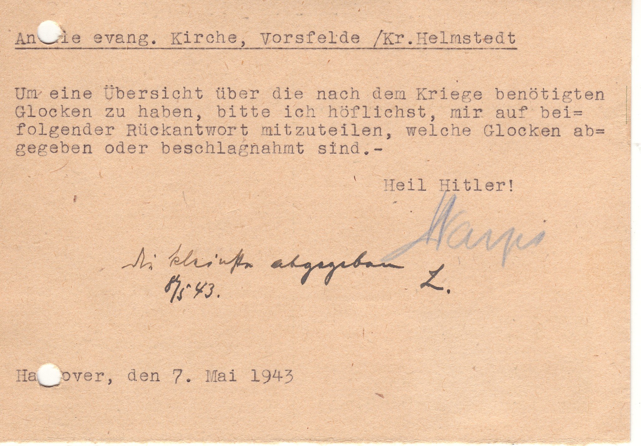 Für die Übersicht nach dem Kriege bitte mitteilen, welche Glocken abgegeben wurden (8.5.43 Meldung abgegeben)