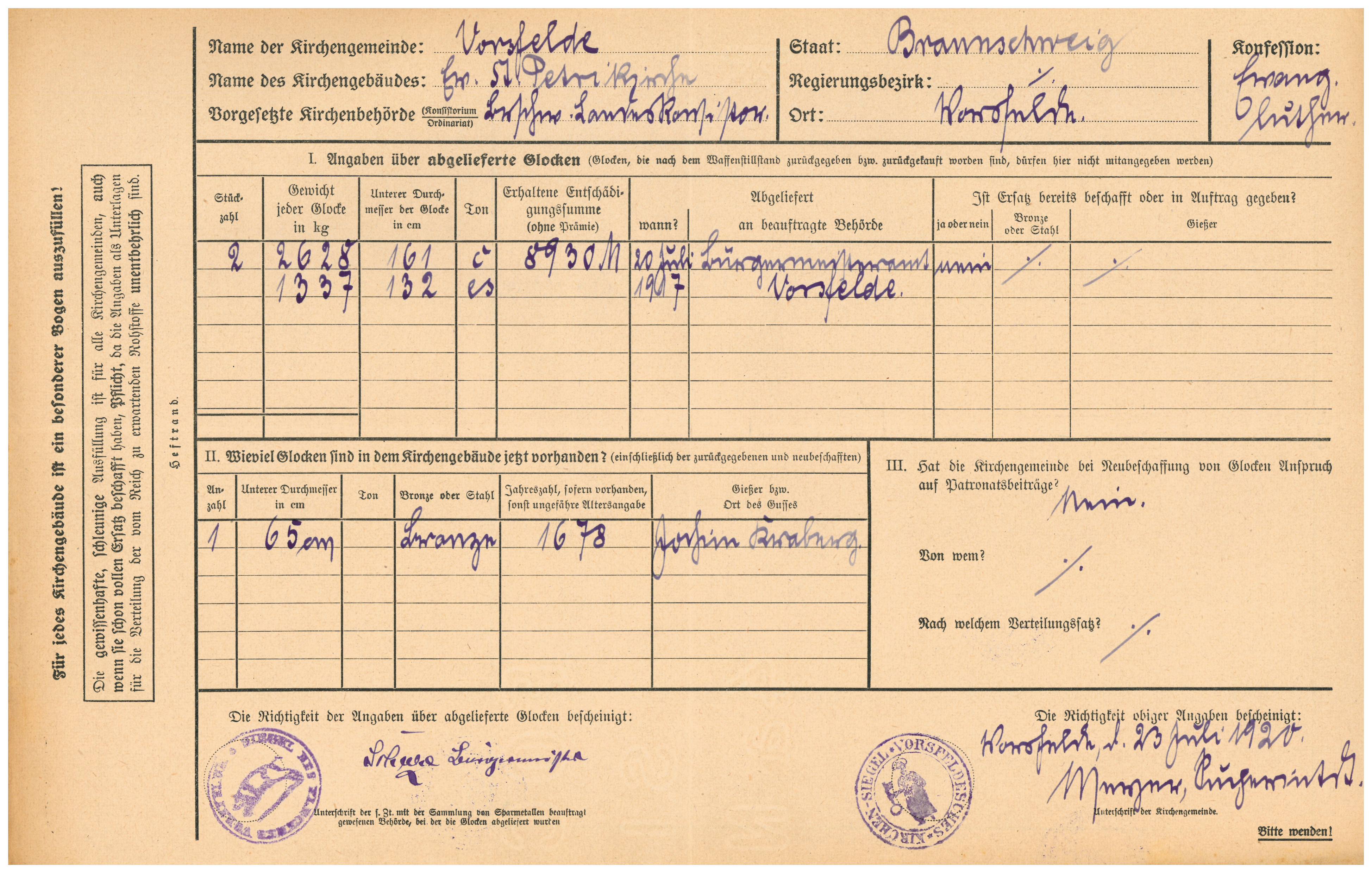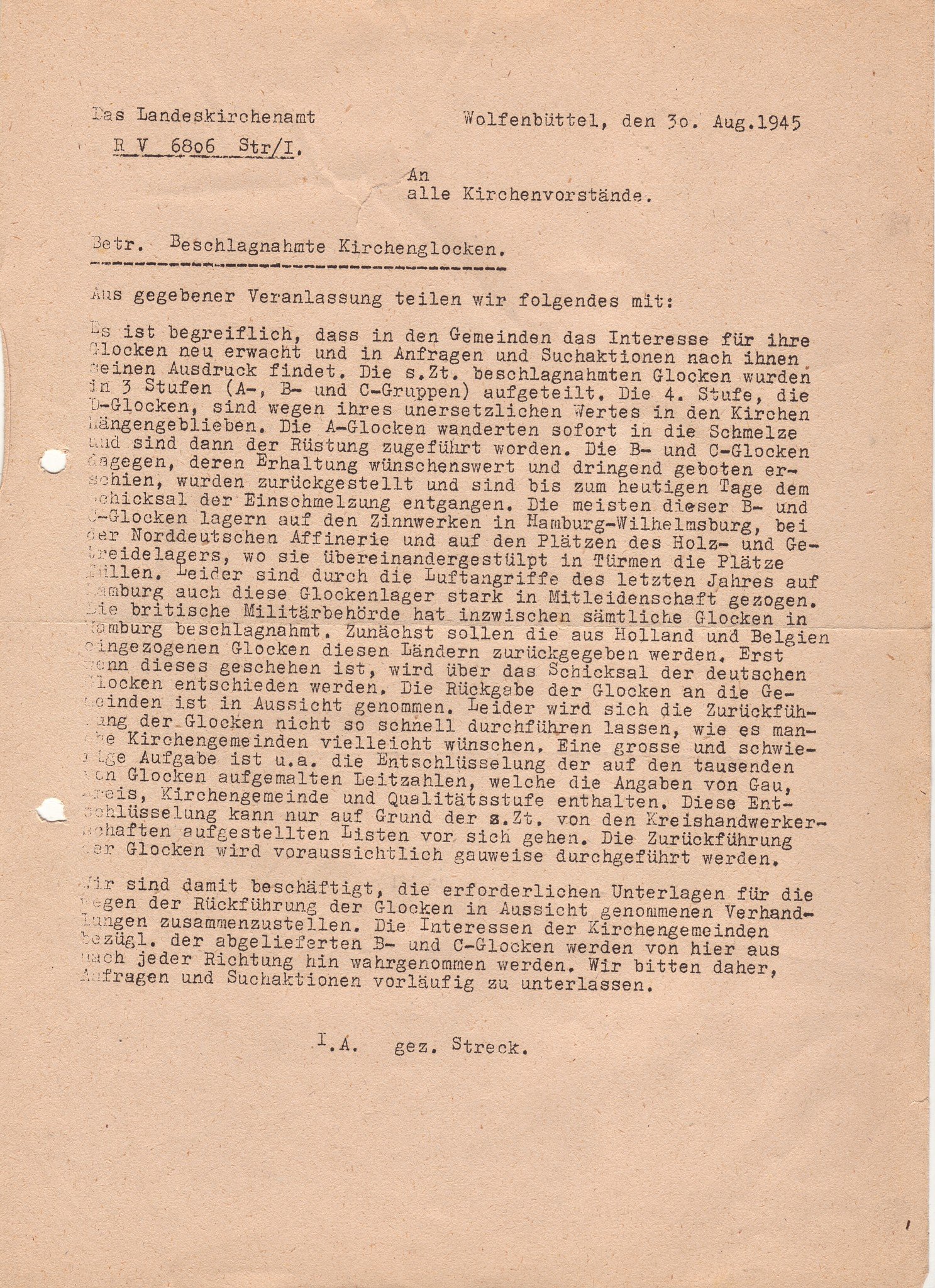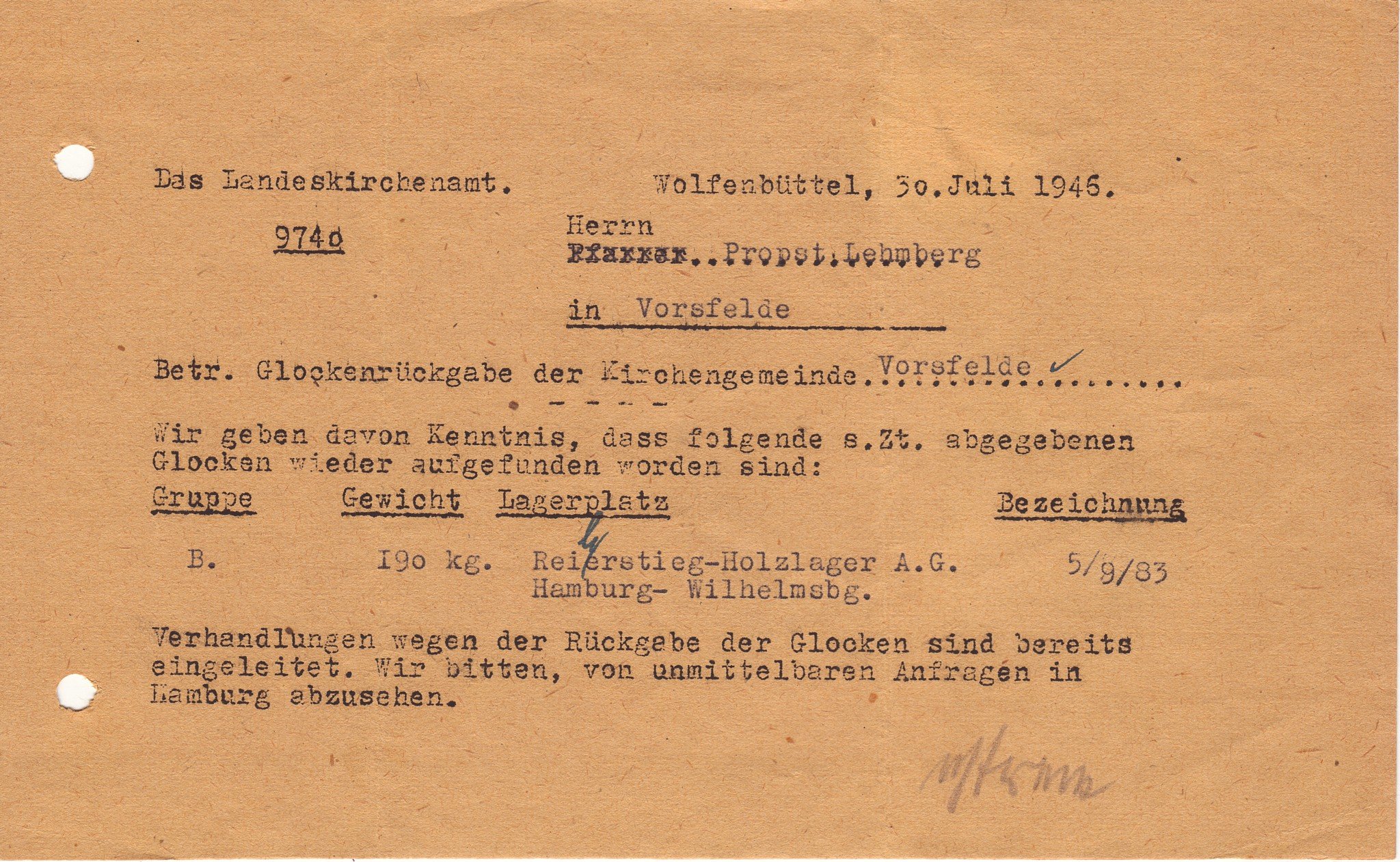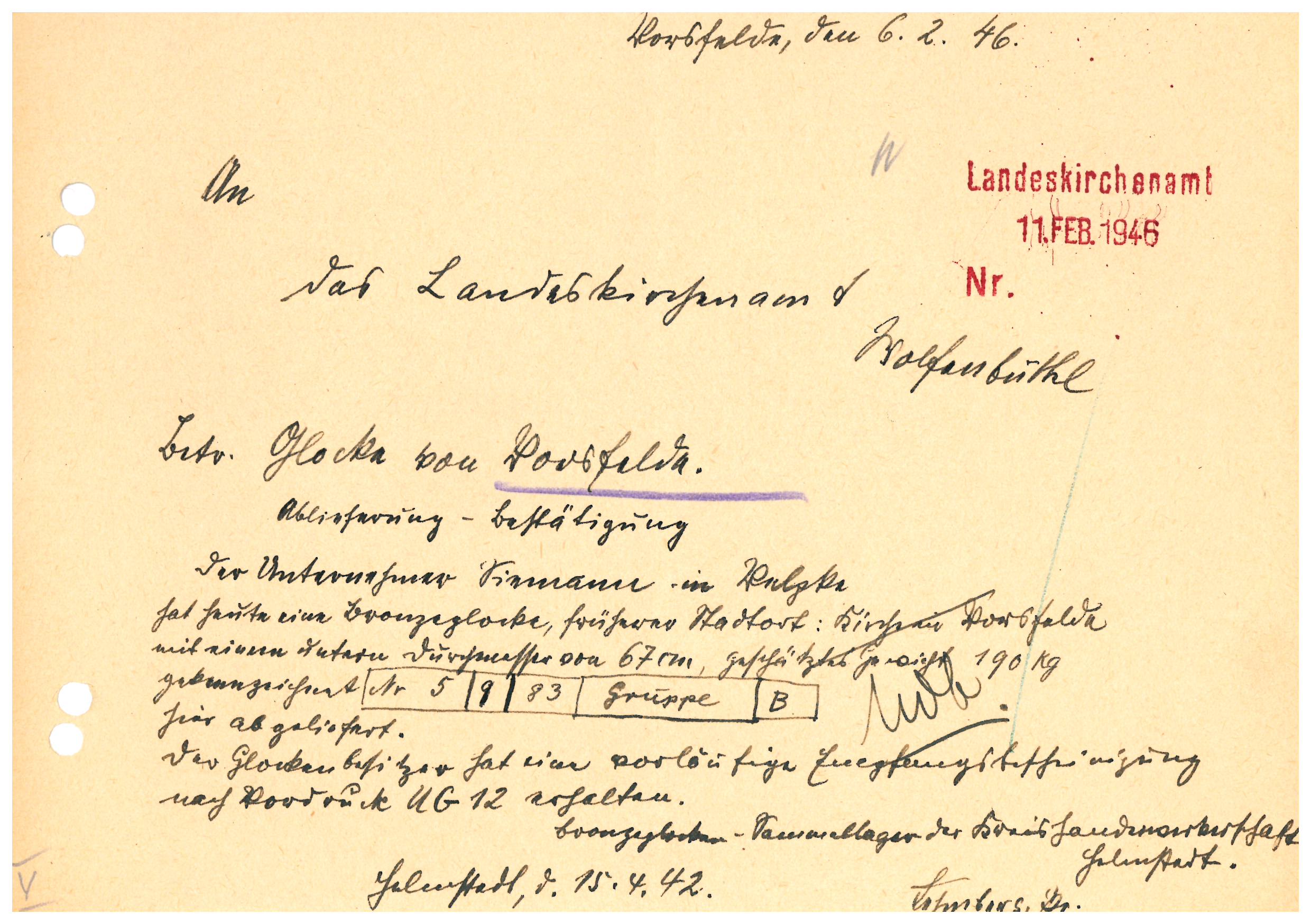 Für die Übersicht nach dem Kriege bitte mitteilen, welche Glocken abgegeben wurden (8.5.43 Meldung abgegeben)
