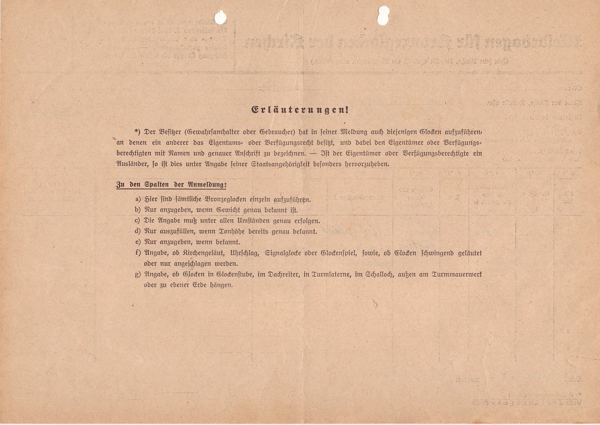 Metallreserve für die Kriegsführung schaffen. Bronzeglocken und Kupferbauteile erfassen, Bronzeglocken umgehend abliefern. Nach Kriegsende gibt es Ersatzmetall und angemessene Entschädigung.