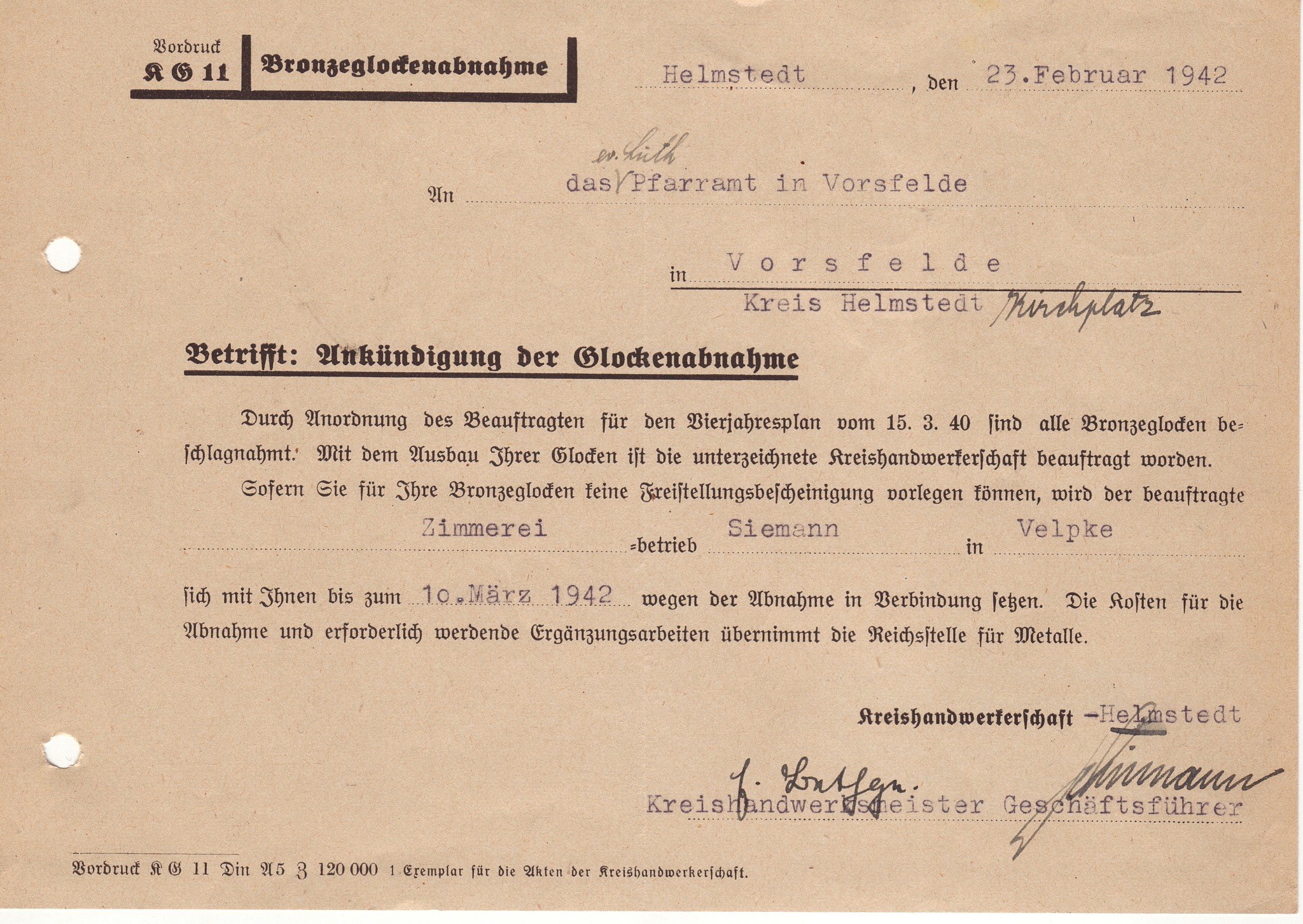 Zimmerei Siemann aus Velpke wird sich bis 10.3.1942 zur Abnahme der Glocke in Verbindung setzen