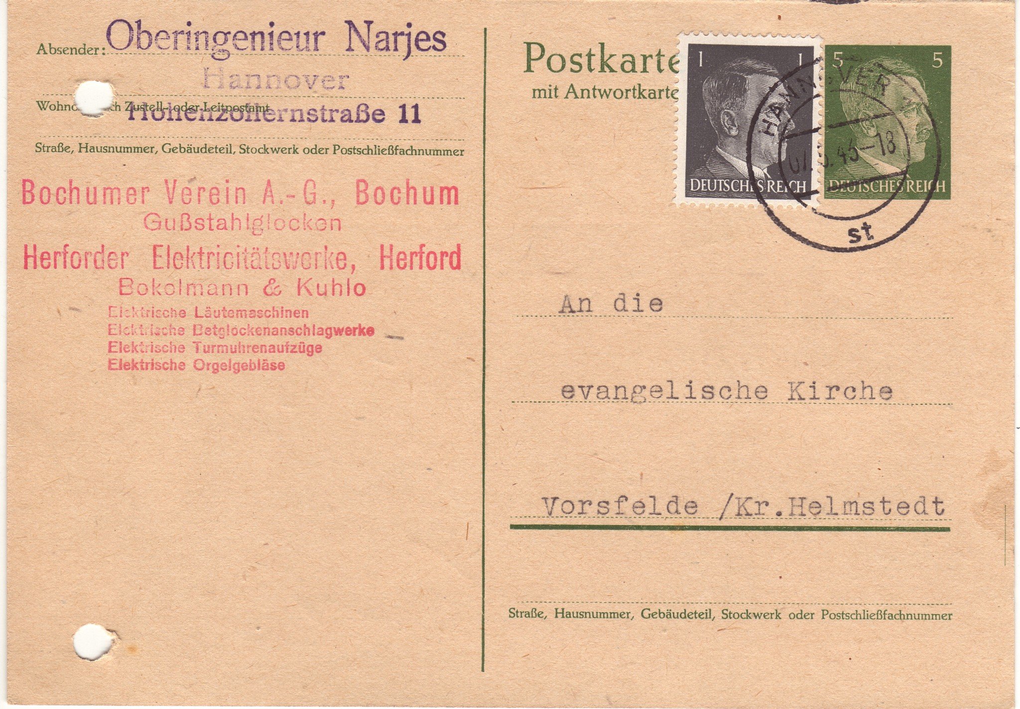 Oberingenieur Narjes Hannover (Bochumer Verein Gusstahlglocken) an Kirchengemeinde: