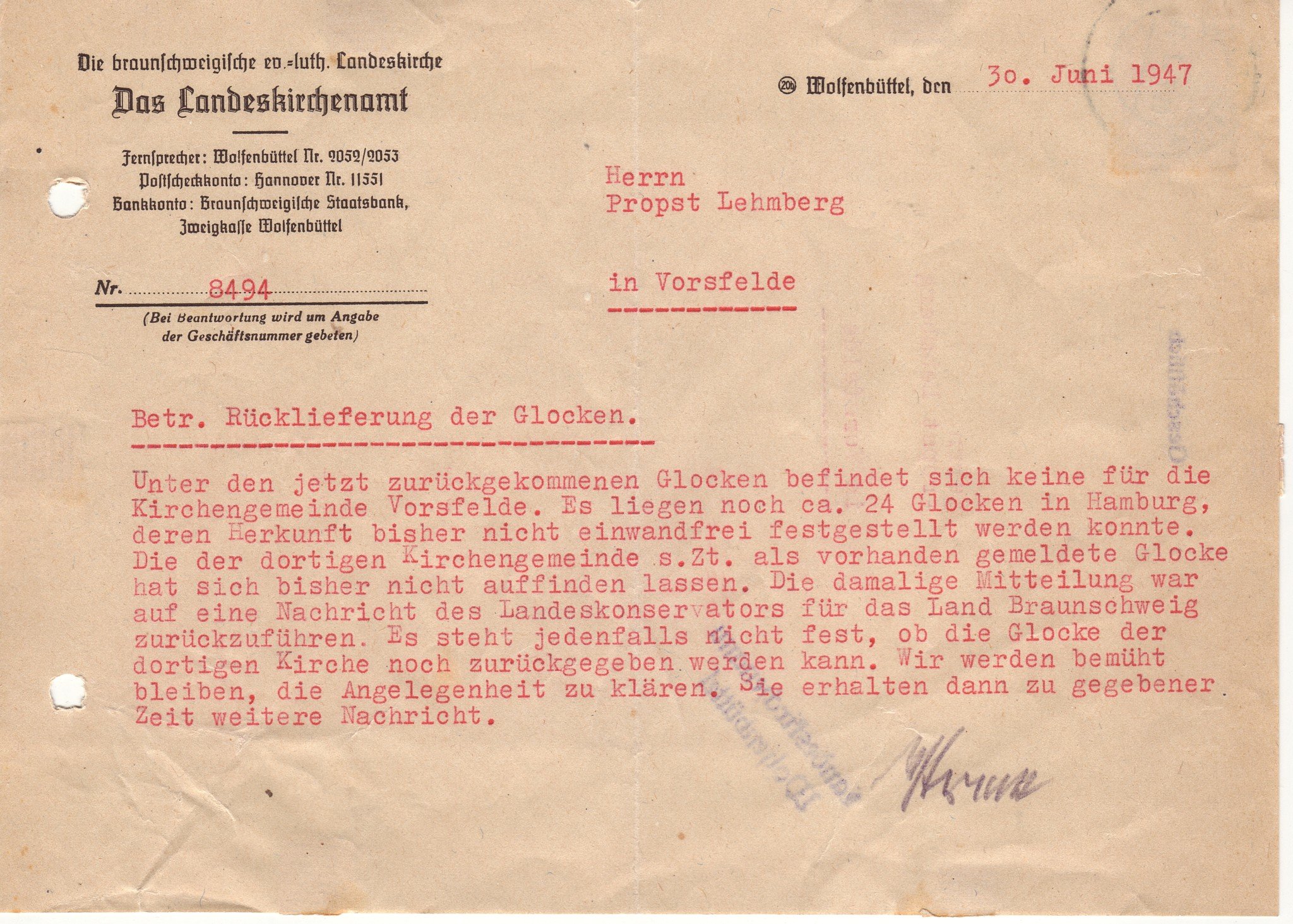 Unter den zurückgekommenen Glocken ist die vorsfelder nicht. Es sind noch 24 Glocken in Hamburg, es ist unklar, ob darunter die vorsfelder ist.