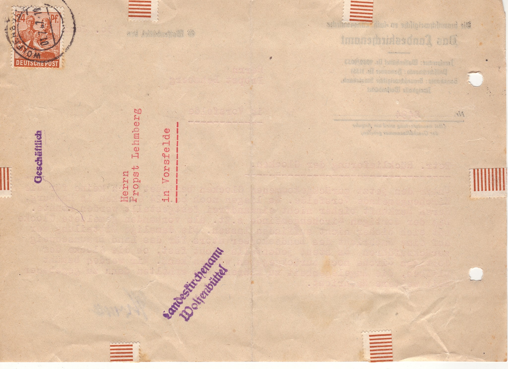 Landeskirchenamt (Röpke), Finanzabt. (Hoffmeister) an Herrn Kohlstrik in Vorsfelde (Formulardruck, Adressat handschriftl. eingetragen):