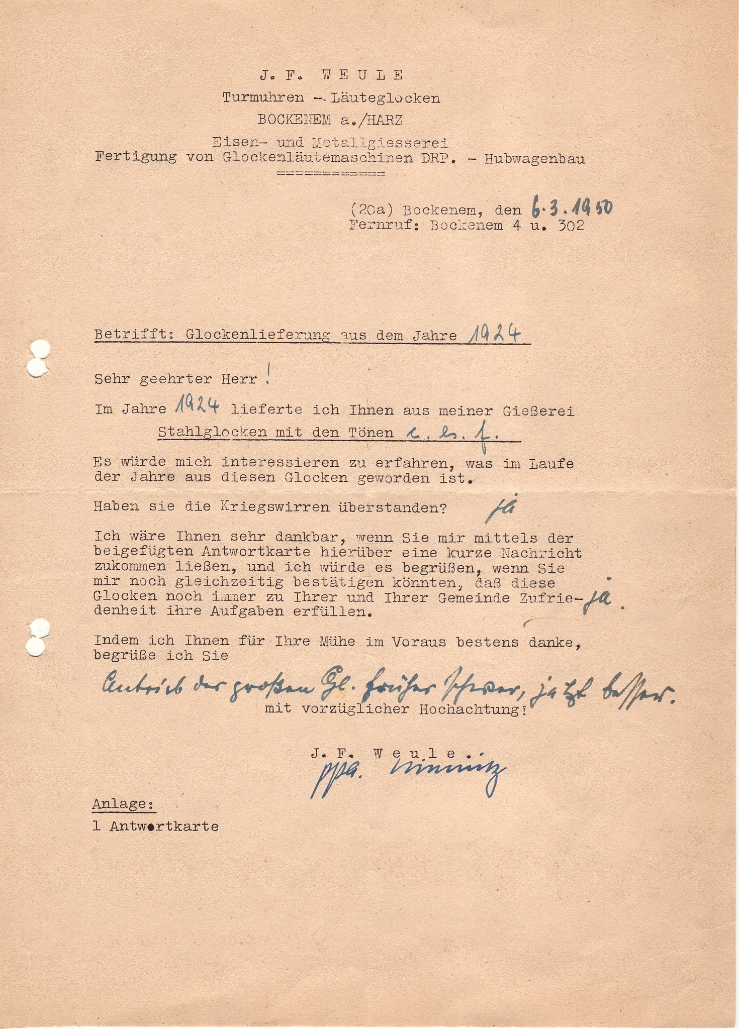 Was ist mit den drei 1924 gelieferten Glocken, haben sie die Kriegswirren überstanden? Antwortkarte